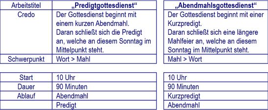 Predigt und Mahlfeier gibt es üblicherweise in beiden Formen. Der Unterschied besteht in Reihenfolge und Schwerpunkt.